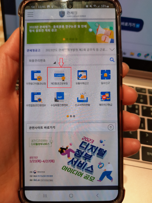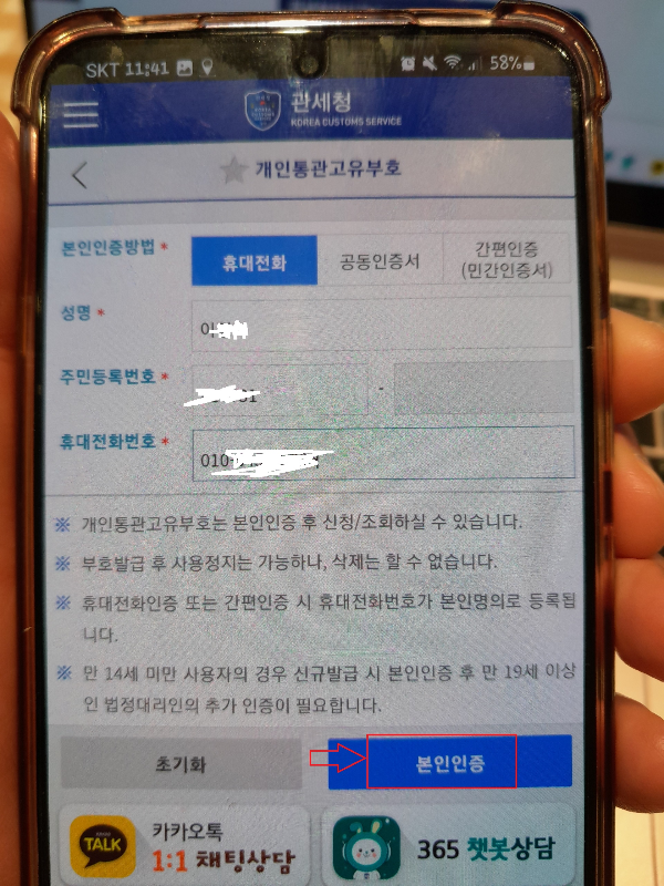 개인통관고유부호 조회 - 관세청 앱